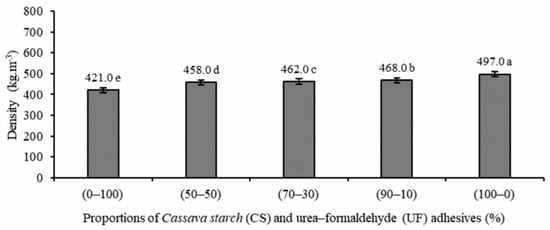 The density test results showed that the particleboards from the treatment bonded with 100% Cassava starch (CS) adhesive had the highest value, 497.0 kg cm−3. The treatment (0–100) of 100% urea–formaldehyde (UF) adhesive had the lowest value, 421.0 kg cm−3. From the analyses, it is possible to verify that the increase in the percentage of Cassava starch (CS) adhesive promoted an increase in the density of the particleboard panels (Figure 3).