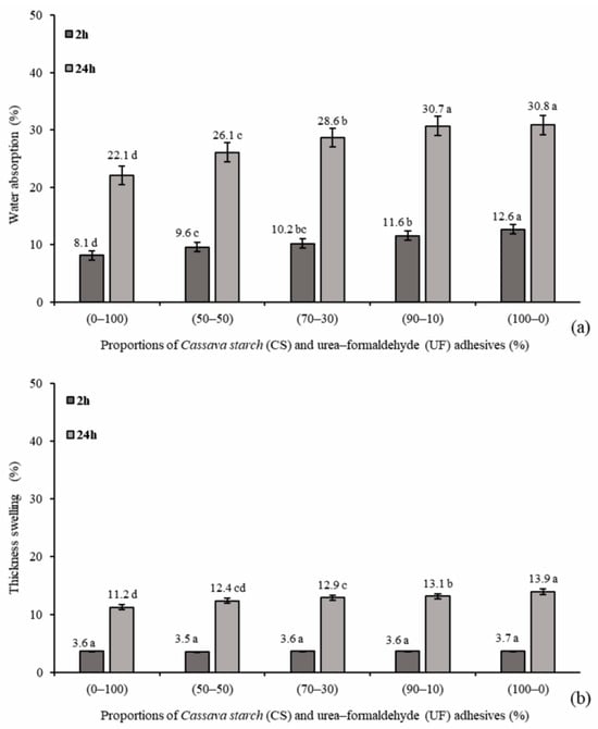 The water absorption with the treatment consisting of 100% Cassava starch (CS) adhesive presented the highest values after 2 and 24 h of immersion, 12.7 and 30.8%, respectively. The lowest values for the same parameters were 8.1 and 22.1% for the treatment bonded with 100% urea–formaldehyde (UF). The analysis showed that increasing the percentage of natural Cassava starch (CS) adhesive in the particleboards increased the water absorption property (Figure 4a).