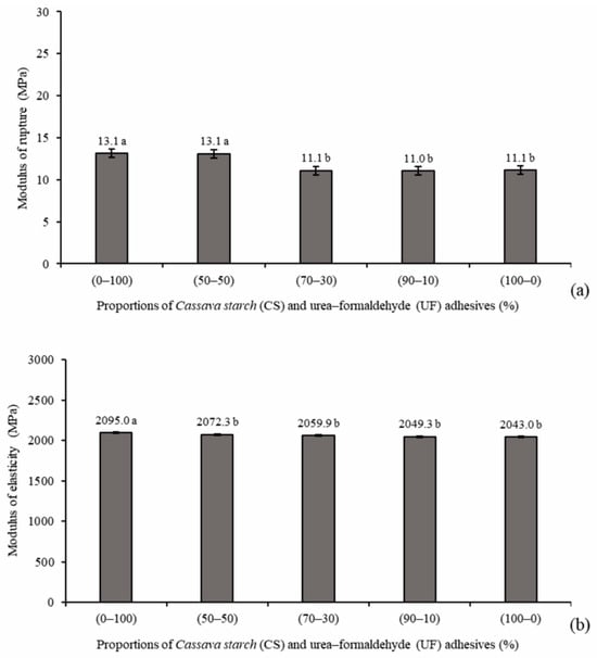 Modulus of rupture (a) and elasticity (b) for panels produced with Theobroma cacao wood wastes bonded with Cassava starch (CS) and urea–formaldehyde (UF) adhesives. Means followed by different letters are statistically dissimilar, determined the Tukey test at 95% probability.