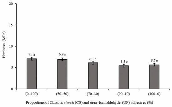The results for Janka hardness had similar behavior to those for the static bending tests. The 100% urea–formaldehyde (UF) treatment presented the highest value, 7.1 MPa. However, the result is statistically equal to 6.9 MPa, corresponding to the 50–50 treatment. The 100% Cassava starch (CS) treatment had the lowest value, 5.7 MPa (Figure 6). The analysis showed that increasing the percentage of CS adhesive in the particleboards decreased the hardness property. It is also possible to verify that the CS adhesive percentage of 50% is the maximum limit for use in panels without significantly reducing their hardness property. Menali et al. [36] state that a decrease in the Janka hardness property may be related to the particleboards’ low compaction and the slenderness index of the particles used to manufacture the material. The characteristics of the particles used in the panels must be considered during manufacturing, as they vary according to the type of material used [36]. Still, the panels evaluated in the research showed Janka hardness values higher than 5.6 and 4.6 MPa for panels developed with Ceiba pentandra particles and UF and CS adhesives [14]. Particleboards made that way can positively contribute to reducing environmental problems. According to Martins et al. [37], developing products with lignocellulosic waste reduces waste in unsuitable environments, thus reducing public health problems caused by disease-causing vectors.