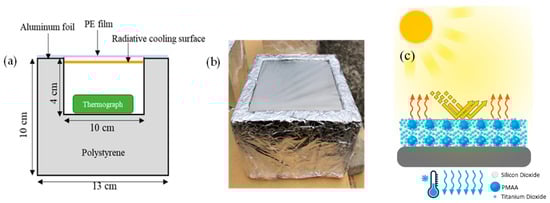 The radiative cooling film was fabricated using the common method of the blade-coating technique. The materials included 1 μm SiO2 microsphere powder (Taiwan Union Abrasives Corp., Kaohsiung, Taiwan), silane-69 (Si-69) (Evermore Corp., Taipei, Taiwan), 2 μm PMMA balls (Aurora Applied Material Co., Ltd., Tainan, Taipei), and ~0.2 μm rutile TiO2 particles (Chemours, Wilmington, DE, USA). SiO2 solution and the polymer solution binder were prepared separately. For the SiO2 solution, the preparation involved mixing silicon oxide microsphere powder (SiO2, 1.39 g) as the template powder with Si-69 (silanol-69, 0.48 g) as a dispersant. Then, for the binder solution, a PMMA (1.15 g) with and without 5 vol% of TiO2 in a 1,2-dichloroethane (1,2-DCE 99.5%, Fisher Chemical, Berlin, Germany) solution (15 mL) was prepared. Based on the previous study [], the rutile phase exhibits a higher refractive index of 2.73 than that of the anatase phase (2.51) for TiO2, which suggests that the rutile phase reflects more sunlight and has a better cooling performance than that of the anatase phase. Also, the 5 vol% of TiO2 particles minimized the cracking of thick films by agglomeration of TiO2 particles based on the previous reports of Cheng et al. [] and Sun et al. []; therefore, the condition of adding 5 vol% of rutile TiO2 particles was chosen in this study. This mixture was continuously stirred for 1 h, forming a turbid solution. A control solution without TiO2 was also synthesized as a template film. Stainless steel (SS) 304 was chosen as the film substrate, and the thickness of the radiative cooling film was adjusted to approximately 80 μm. Each substrate was evenly coated and dried immediately without any additional heating. For testing the passive daytime radiative cooling (PDRC) film, a temperature data logger (model 88160, AZ Instrument Corp., Taichung, Taiwan) was employed alongside a custom-made chamber designed of about a 10 cm × 10 cm stainless steel 304 substrate coated using the blade-casting method. The insulation layer was dimensioned at 13 cm × 13 cm × 10 cm, with a chamber measuring volume of 10 cm × 10 cm × 4 cm (Figure 1a). Polystyrene was used to insulate and prevent external heat transfer, ensuring accurate measurement of the performance of PDRC films. The detailed design of the chamber is shown in Figure 1. To define the total percentage of each material on each film, a volume fraction (Vf) calculation has been carried out based on the equation of Vf = Vcomponent/Vtotal.