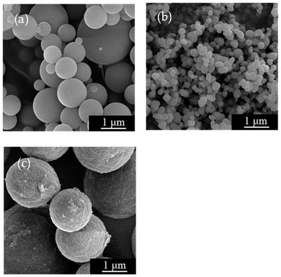 SEM images of (a) SiO2, (b) TiO2, and (c) PMMA particles.