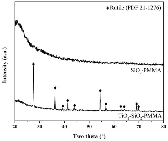 The XRD patterns in Figure 3 reveal the structural intricacies and crystalline characteristics of the SiO2-PMMA and TiO2-SiO2-PMMA thick films. For the SiO2-PMMA thick film, the XRD pattern shows a broad hump around 20–30°, a hallmark of the amorphous nature of both SiO2 and PMMA. On the other hand, the TiO2-SiO2-PMMA thick film displays sharp diffraction peaks, corresponding to the rutile phase of TiO2, marked by a symbol (JCPDS number of 21-1276), indicating the TiO2 on the rutile crystal structure. Based on the previous references [,], this is indicative of the refractive index of the rutile TiO2 phase. As shown in Figure 3, the crystallite size of TiO2 in the TiO2-SiO2-PMMA film is 0.27 ± 0.05 μm, calculated using the Scherrer equation.