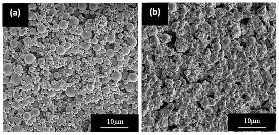 The SEM image of SiO2 particles demonstrates a uniform distribution of spherical particles with a relatively smooth surface morphology. However, the TiO2 particles, as shown in Figure 2, exhibit a more complex and agglomerated morphology than SiO2. The particles of TiO2 are smaller and appear to form clusters or aggregates. This morphology is advantageous for radiative cooling because TiO2 has a high covering area [], enhancing the visible light’s scattering. The agglomerated nature of TiO2 particles can contribute to a broader scattering spectrum, thereby improving the cooling performance of the composite films when incorporated with other materials [].