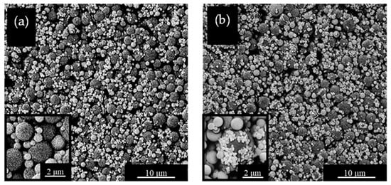 Figure 5 presents back-scattered electron (BSE) images of (a) SiO2-PMMA and (b) TiO2-SiO2-PMMA thick films, with insets providing details on distinguishing every particle and higher magnification views at a scale of 2 μm. The SiO2-PMMA thick film shows a uniform distribution of spherical SiO2 particles within the PMMA matrix, with the inset revealing smooth and evenly sized particles, crucial for achieving high transparency and minimal light scattering. In contrast, the TiO2-SiO2-PMMA thick film features a more complex microstructure, with a denser packing of varying-sized particles and larger TiO2 clusters surrounded by smaller SiO2 particles. Due to its higher atomic number, the brighter appearance of TiO2 in the BSE images underscores its obvious contribution to the composite’s increased scattering and reflective properties [,].