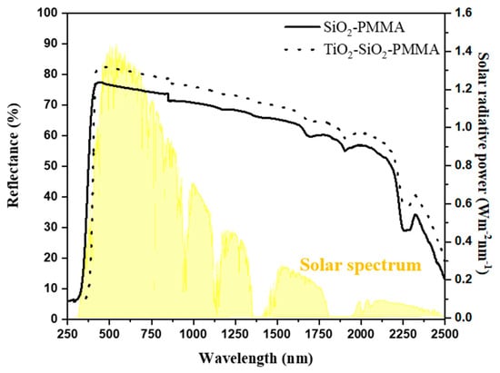 This work focused on the precise control and optimization of the size distribution of SiO2 and TiO2 particles to maximize the cooling effect while minimizing UV absorption. Previous studies have discussed the advantages of mixed-sized particles or combining TiO2 and SiO2 for improving solar reflectance []. However, our research advances this by focusing on a synergistic design where the particle sizes are tailored to achieve optimal scattering across different solar spectrum regions. While previous research has utilized mixed-sized particles, our approach fine-tunes the particle size distribution of SiO2 and TiO2 specifically to enhance light scattering in both the visible and near-infrared regions, contributing to more effective radiative cooling. TiO2 particles are used for visible light scattering, whereas larger SiO2 particles help scatter near-infrared light without contributing to UV absorption. Meanwhile, the PMMA was used as a binder due to its better dispersion and distribution in composite materials [], addressing the challenge of heating from UV absorption in TiO2, as illustrated in Figure 1c.