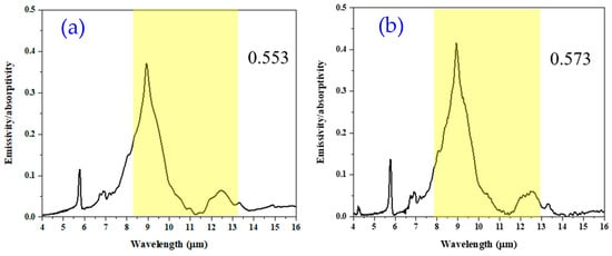 Infrared emissivity data of (a) SiO2-PMMA and (b) TiO2-SiO2-PMMA thick films.