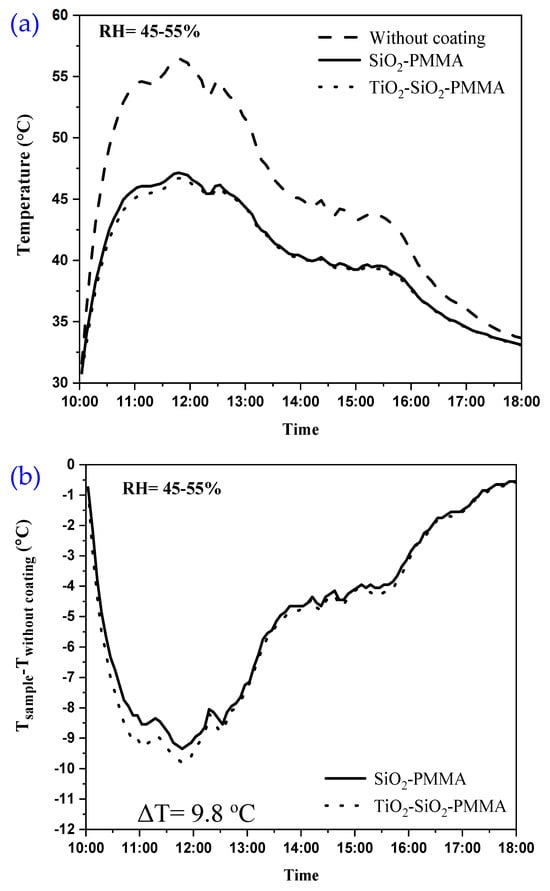 The graphs in Figure 8 illustrate the temperature profiles and temperature differences for substrates with and without the SiO2-PMMA and TiO2-SiO2-PMMA thick films. In Figure 8a, the black curve represents the temperature profile of the uncoated substrate, showing higher temperatures throughout the day, peaking above 55 °C under the camber. In contrast, the substrates coated with SiO2-PMMA and TiO2-SiO2-PMMA exhibit lower temperatures, peaking just above 45 °C. The TiO2-SiO2-PMMA thick film shows a slightly better cooling performance than the SiO2-PMMA thick film, maintaining a lower temperature throughout the day (the test was carried out in the summertime with a relative humidity (RH) of about 45–55% in the National Taiwan University of Science and Technology (NTUST) campus, Taiwan). Figure 8b highlights this cooling effect by depicting the temperature differences between the coated and uncoated substrates. Both coatings consistently reduce the substrate temperature by 8.0–9.8 °C, with the TiO2-SiO2-PMMA thick film offering a marginally more obvious reduction. These results underscore the effectiveness of the composite coatings in enhancing radiative cooling, with the TiO2-SiO2-PMMA thick film providing superior performance. This enhanced cooling capability is due to the synergistic combination of materials, which optimizes solar reflectance and thermal emissivity, making these coatings highly effective for passive radiative cooling applications.
