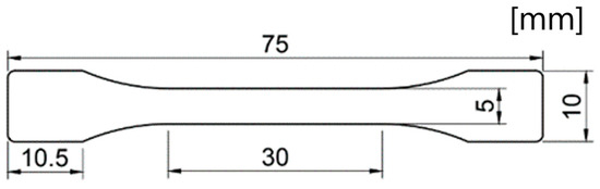 An ultra-compact manual hydraulic heating press (Model IMC-195A-E, Imoto Mfg. Co., Ltd., Miki, Japan) was used to fabricate specimens. Dumbbell-shaped specimens were obtained by casting the pellets inside a metal mold (see Figure 1), which was hot-pressed at a temperature of 180 °C and pressure of 3 MPa for 8 min. The mold was then taken out and allowed to cool for 10 min before the completed specimen could be extracted. The thicknesses and widths of the specimens were measured at three points (at the middle of the specimen and at the two edge points) using a digital thickness gauge (Model ID-C112XBS, Mitutoyo Corporation, Kawasaki, Japan).