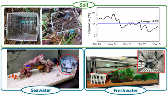 Photos of the different biodegradation environments; outside soil, seawater, and freshwater aquariums. Red circles indicate the positions of material specimens inside the aquariums.