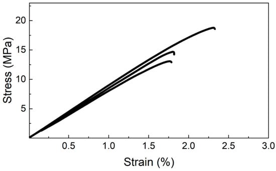 Stress–strain curves of three specimens of the fabricated PLA–bark composite.
