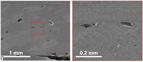 Cross-section images of the composites are shown in Figure 4. Voids ranging in size from 0.01 to 0.3 mm were observed inside the microstructure. This was possibly due to air bubbles getting stuck between the pellets during the dumbbell fabrication process. Moisture or volatile compounds in the bark particles may vaporize during hot pressing, creating voids within the composite. Generally, fibers were well-dispersed inside the polymer matrix. However, large fragments of bark were also present, and holes were often concentrated around them. The uneven distribution of bark particles in the PLA matrix can result in localized areas with poor compaction, leading to the formation of voids, as well. The voids act as stress concentration points, which explains the observed decrease in Young’s modulus, UTS, and fracture elongation.