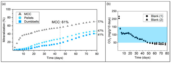 (a) Mineralization as a function of time and (b) CO2 evolution of the blanks over time.