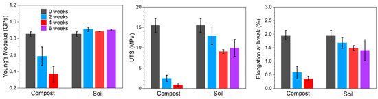 The changes in tensile properties during compost and soil degradation are summarized in Figure 6. In compost, the specimens degraded fast, and major loss of mechanical properties was observed after only 2 weeks. After 6 weeks, whole specimens could no longer be extracted. For specimens degraded in soil, Young’s modulus increased slightly over the duration of the experiment, but the UTS and elongation at break decreased. The UTS decreased rapidly during the first 4 weeks and stopped decreasing after 6 weeks. It should be mentioned that in both compost and soil, some specimens were destroyed during the extraction, and thus, only two specimens from each environment could be tested every 2 weeks. Therefore, the uncertainty of the data is large, and in further experiments, the number of specimens should be increased.