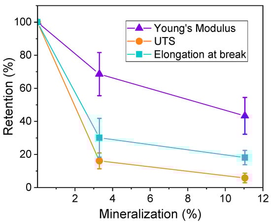 Graph showing the relationship between mineralization and retention rate of Young’s modulus, UTS, and elongation at break.