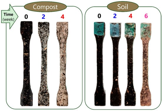 Photos of specimens before and after 2, 4, and 6 weeks of biodegradation in compost and soil.