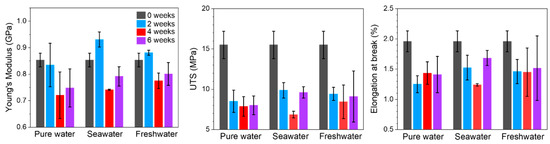 Figure 9 shows the change in mechanical properties of the specimens degraded in the three aquatic environments. Young’s modulus increased or remained mostly unchanged after 2 weeks, possibly as a result of embrittlement caused by hydrolysis. In all three environments, it reached a low after 4 weeks and then increased slightly again after 6 weeks. The UTS decreased dramatically after only 2 weeks in all three environments, after which there were only minor differences at 4 and 6 weeks. The elongation at break followed a similar pattern, with the aquatic environments causing a loss of elasticity after only 2 weeks. In this experiment, only two duplicate specimens were tested at a time, so in order to better understand the degradation process and how it affects the mechanical properties, a larger number of specimens may be used. It is possible that mechanical properties are affected by a variety of factors. For example, as water is absorbed by the cellulose fibers, the interface between the polymer matrix and fibers is damaged, causing the material to weaken. The polymer is most likely also broken down by hydrolysis or by biodegradation, with amorphous areas degrading first [24]. This would cause an increase in crystallinity and embrittlement of the material. During the duration of this experiment, the differences in losses of mechanical properties between pure water, seawater, and freshwater were small. It could not be established if the presence of microorganisms (seawater and freshwater) induced biodegradation, so it is assumed that most of the degradation was due to hydrolysis. To understand the degradation process better, the experiment could be performed over a longer timeframe and use a larger number of specimens.
