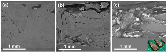 Cross-sections of the composite: (a) Before biodegradation in compost, (b) after 4 weeks, and (c) after 11 weeks in compost, as well as a photo of the dumbbell-shaped specimen fragments.