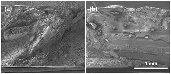 Concerning the specimens degraded in water and soil, the changes were not as dramatic as those for the specimens degraded in compost. However, compared to the non-degraded specimen (Figure 4 and Figure 10a), there were signs of damage and increased roughness: for example, deformation of the surface (particularly Figure 12a), delamination and formation of holes at the fiber–matrix interface. These findings would explain the loss of tensile strength.