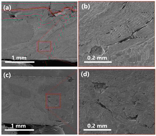 Cross-section of specimens after 6 weeks of biodegradation in (a,b) soil and (c,d) seawater. The red line in (a) shows the edge of the specimen, with the area above the red line being UV-resin.