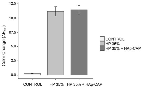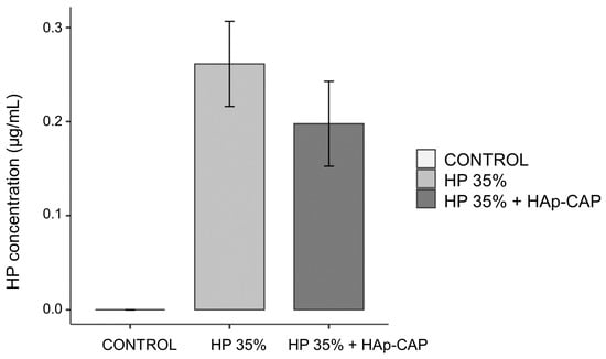 2.6. Addition of HAp-CAP in an In-Office Bleaching Gel: Hydrogen Peroxide Diffusion inside the Pulp Chamber and Bleaching Efficacy Evaluation