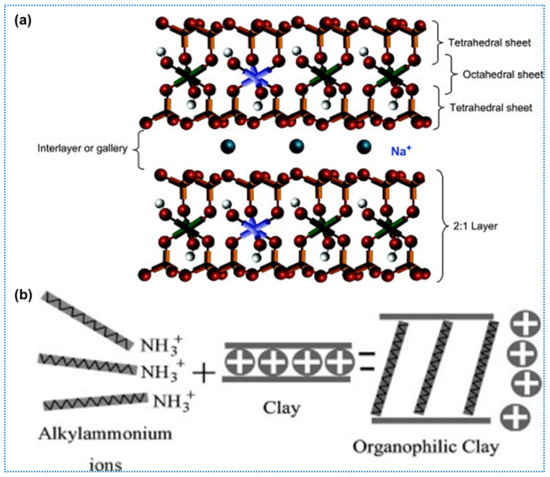 (a) Structure of sodium montmorillonite [64] and (b) organic modification of nanoclay [2].