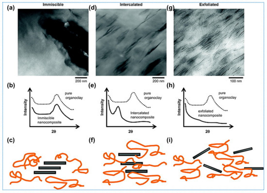Types of nanoclay dispersion in polymers and their associated TEM, XRD, and schematic micrographs (a–c) phase-separated/immiscible, (d–f) intercalated, and (g–i) exfoliated morphologies [64].