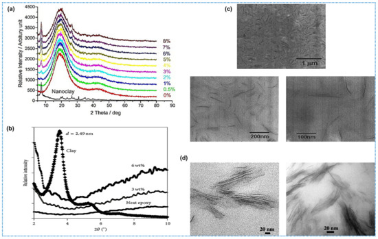 This structure forms when one or a few polymer chains enter the interlayer or gallery, causing the silicate layers to maintain an ordered multilayer structure but with enlarged d-spacing (Figure 4d–f). The D-spacing typically ranges between 20 and 30 Å, leading to improved properties compared to phase-separated microstructures [63,64,77].