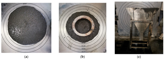 The specimen dimensions were 100 mm × 100 mm × 100 mm and the work was conducted at the Laboratory of Panshi Building Materials Laboratory in Bijie City, Guizhou Province. According to the test method for the properties of an ordinary concrete mixture (GB/T 50080-2002), the physical properties of the concrete mixture, such as extensibility, clearance rate (J-ring Test, V-type funnel test), air content, etc., were as shown in Figure 7.