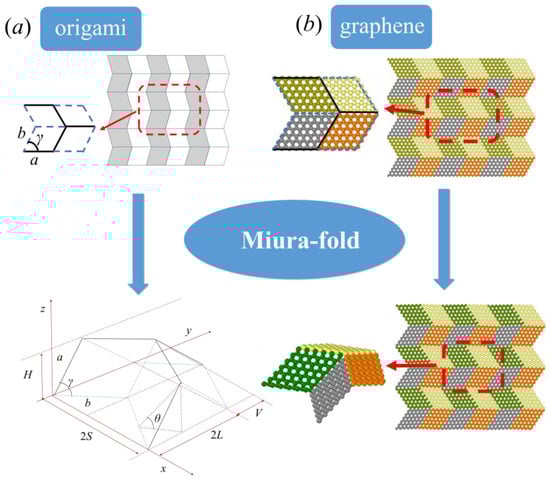 The main parameters of the basic unit of Miura origami are shown in Figure 1, where a and b are the lengths of the two sides of the parallelogram of the folding front in the basic unit in Miura folding. The acute angle γ is the angle between two neighboring sides of the parallelogram in the basic cell in the Miura fold. The dihedral fold angle θ is the angle between the parallelogram in the basic cell and the xOy plane after folding. In order to satisfy the requirements of the creases, the acute angle of the Miura folding cell can only be chosen as 30° or 60° due to the periodic symmetry of graphene. When the acute angle is 60°, the valid value range of the dihedral fold angle should be between 0° and 70.53°, and the geometric parameters a and b follow the below formulas, respectively.