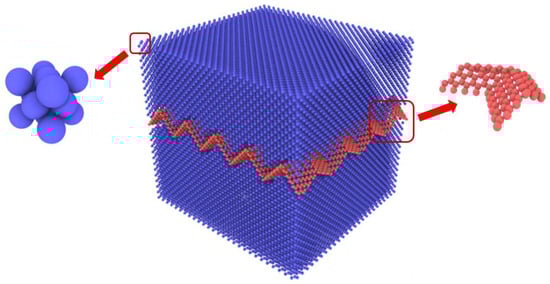 As is illustrated in Figure 2, the matrix is composed of copper atoms that are in the fashion of face-centered cubic (FCC) packing, and the MD model of single-crystal copper is built along [1 0 0], [0 1 0], and [0 0 1] crystal orientations. In the modeling, the periodical boundary conditions for copper lattices are also taken into account. In order to satisfy the periodical boundary conditions, the zigzag direction of origami graphene and the [1 0 0] crystal orientation of the copper matrix is set as the x direction of the model and the armchair direction of origami graphene, and the [0 1 0] crystal orientation of the copper matrix is set as the y direction. The origami graphene/copper nanocomposite is finally obtained after the Miura origami structure is embedded in the copper matrix, which is shown in Figure 2.