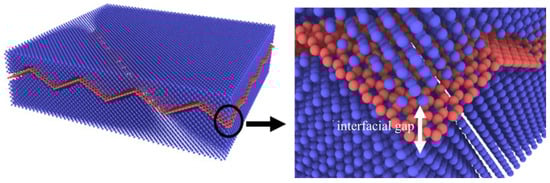 As shown in Figure 6, the interfacial strengths of both origami graphene/copper nanocomposites and monolayer graphene/copper nanocomposites show the same trend with the change in interfacial gap: the interfacial bonding energy is the smallest and the structure is the most stable in the equilibrium position. When the interfacial gap is smaller than the equilibrium interfacial gap, the force between the interfaces is repulsive, and the repulsive force increases sharply with the decrease in the interfacial gap; therefore, the bonding energy of the composite material will also increase sharply with the decrease in the interfacial gap. When the interfacial gap is smaller than the equilibrium interfacial gap, the force between the interfaces is attractive and will gradually decrease with the increase in the distance between atoms. Therefore, the bonding energy of the composite material will also decrease slowly with the increase in the interfacial gap and finally stabilize at a constant value, which indicates that the interfacial strength of the composite material will slowly tend to 0 with the increase in the interfacial gap. The results in this paper fit with those of Xu and Buehler [49]. The simulation results show that the minimum binding energy of origami graphene is different from that of monolayer graphene, and the minimum binding energy appears in different interfacial gaps between them. Compared to monolayer graphene/copper nanocomposites, the minimum binding energy of origami graphene/copper nanocomposites appears when the interfacial gap is 2.8 Å and its value is −0.04429 eV·Å−2, and is lower than the minimum of monolayer graphene which appears at 3.0 Å and its value is −0.02536 eV·Å−2. This indicates that origami graphene/copper nanocomposites have a higher interface strength than monolayer graphene/copper nanocomposites in the equilibrium state of the system. And when the interfacial gap is 2.8 Å, the origami graphene/copper nanocomposite has the most stable interface. Taking the potential energy and interfacial strength of the origami graphene/copper nanocomposites into consideration, 2.8 Å is the most suitable gap for the following MD simulation.