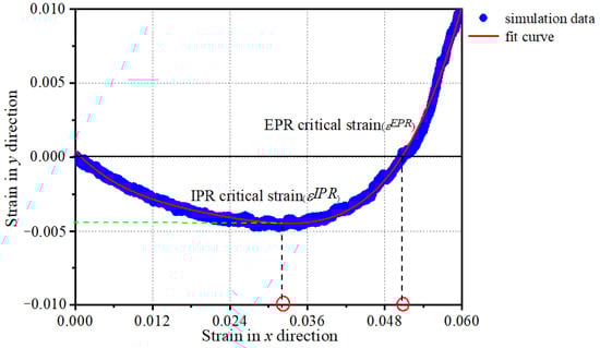 In order to explore the appropriate atomic gap for the simulation, origami graphene basic unit parameters of a = 14.76 Å, b = 25.56 Å, γ = 60°, θ = 60°, and model scales of Å in the x direction, 90.4 Å in the y direction, and 101.4 Å in the z direction were selected to construct the model for simulation. The carbon/copper atomic gaps of 2.4 Å to 3.2 Å were selected for simulation, and the simulated composite material was stretched in the x, y directions. In the strain curves in different directions of the material, the point where the incremental Poisson’s ratio becomes positive is taken as the incremental Poisson’s ratio critical strain (), and the point where the strain in the perpendicular tensile direction turns from negative to positive is taken as the engineering Poisson’s ratio critical strain (), which is shown in Figure 4. The tensile direction strain 0–1 percent of the two-direction strain curve for the fitting calculation of engineering Poisson’s ratio. The elastic modulus is fitted to the stress–strain curve by taking the strain from 0 to 1 percent in the tensile direction.