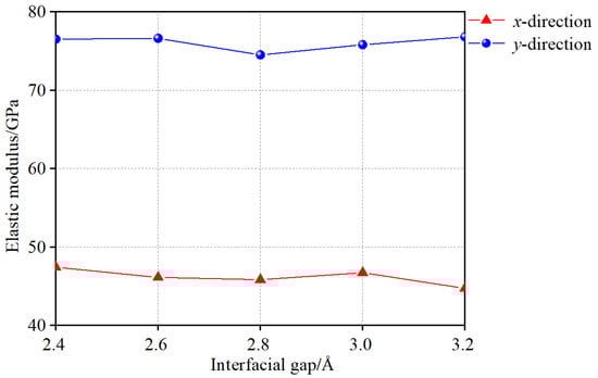 Relationship between the interfacial gap and the variation in elastic modulus in the x and y direction of the composite material.
