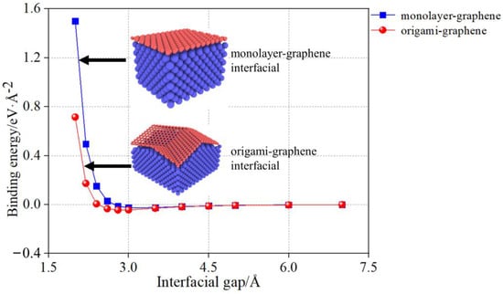 Figure 6 compares the binding energies of two nanocomposites, respectively, enhanced by origami graphene and monolayer graphene. In terms of interfacial strength, the origami parameters are a = 24.60 Å, b = 42.60 Å, γ = 60°, θ = 40°, and the nanocomposite model dimensions are 97.6 Å in the x direction, 90.4 Å in the y direction, and 50.7 Å in the z direction. The interfacial gaps of the material are selected from 2.0 Å to 7.0 Å, and MD simulations of the z direction interfacial separation process were carried out at an ambient temperature of 300 K.