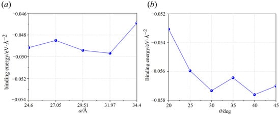 In addition, in order to investigate the effect of side length a of the parallelogram on the mechanical properties of composite materials, γ = 60° and θ = 45°, and an atomic gap of 2.8 Å were chosen for the simulation at a temperature of 300 K. The molecular dynamics simulation of the z direction interfacial separation process is carried out by ensuring that the ratio of the lengths of the two neighboring sides of the origami basic unit parallelogram, a/b, is 1. The side lengths of the origami basic unit parallelogram are set as 22.13 Å, 24.60 Å, 27.05 Å, 29.51 Å, 31.97 Å, and 34.4 Å. The molecular dynamics of the z direction interfacial separation process is also simulated at a temperature of 300 K. After the simulation is completed, the energy of the system before and after the separation in the z direction for each model is recorded, and the relationship between the binding energy of the composites and a can be obtained, as shown in Figure 7 below. From the figure, it can be seen that the variation in the binding energy of the composites with the length a of the parallelogram of the basic unit of origami is not significant, and the minimum value is obtained at the origami parameter a = 31.97 Å, which is −0.0496 eV·Å−2, while the maximum value is obtained at the origami parameter a = 34.4 Å, which is −0.0469 eV·Å−2, with a difference of only about 5.4 percent. It can be seen that in the case of a constant dihedral angle, the change in side length does not affect the crystal plane composition of the interface of origami graphene/copper nanocomposites, and the interfacial atomic spacing of the composites with the same crystal plane composition is also the same. Therefore, the interfacial strength of origami graphene/copper nanocomposites should be the same if the gap is the same and the crystalline structure of the composites is the same, and the results of the simulation shown in Figure 7 are also consistent with this.