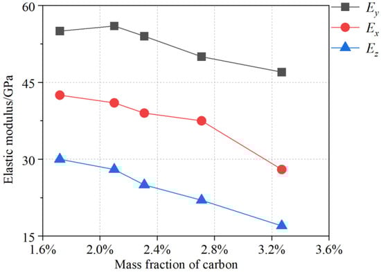 The elastic modulus in three directions is shown in Figure 8. From the figure, it is evident that the elastic modulus of the origami graphene/copper nanocomposite in the y direction shows an increasing trend followed by a decrease, with the maximum value occurring at a carbon mass fraction of 2.10%, reaching 56.3 GPa. The elastic modulus in the x direction is smaller than that in the y direction on average and shows an increasing trend with a decreasing mass fraction of carbon. The maximum elastic modulus in the x direction occurs at a carbon mass fraction of 1.72%, reaching 42.6 GPa. This indicates that the elastic modulus of the origami graphene/copper nanocomposites decreases with an increasing mass fraction of copper, with the average elastic modulus in the y direction being 39.3% higher than in the x direction.