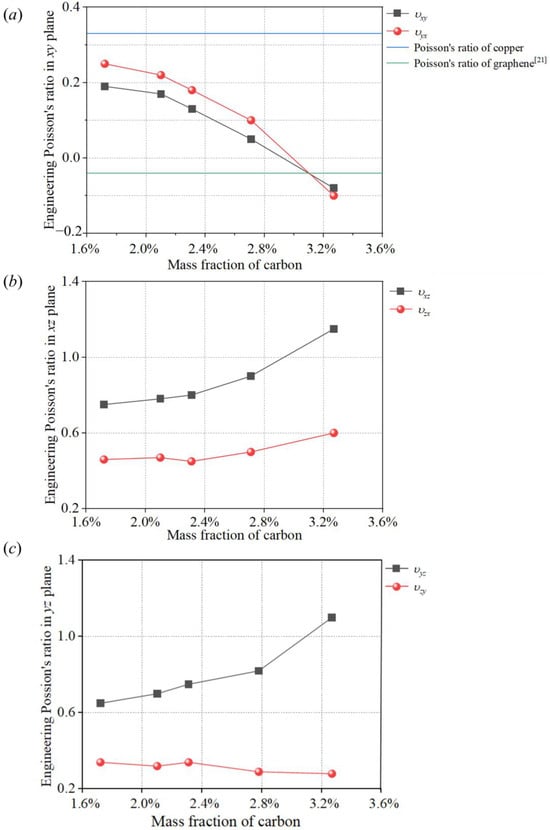The engineering Poisson’s ratio of origami graphene/copper nanocomposites in the x, y, and z directions is shown in Figure 9. It can be seen from Figure 9 that the engineering Poisson’s ratio of the origami graphene/copper nanocomposites in the x and y directions decreases with the reduction in the thickness of the nanocomposite material. The engineering Poisson’s ratio in the armchair direction is greater than that in the zigzag direction when the carbon mass fraction of the model is 1.72% to 2.71%. The engineering Poisson’s ratios of the material whose carbon mass fraction is 3.27% in the two directions appear to have a negative value: the armchair direction is −0.1, and the zigzag direction is −0.08, indicating that the material has demonstrated a negative Poisson’s ratio effect. Poisson’s ratio of pure copper is about 0.33, Poisson’s ratio of graphene is about −0.0409, and Poisson’s ratio of the x direction of the basic unit of the origami graphene is given as
