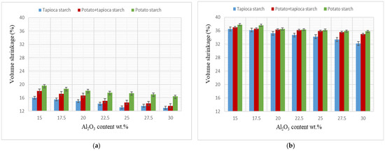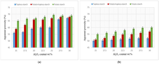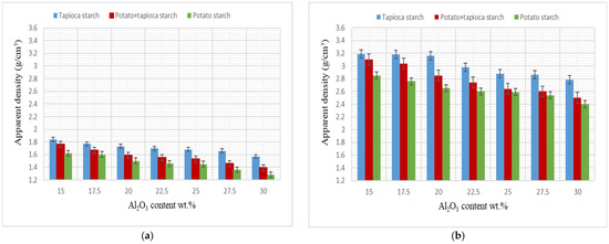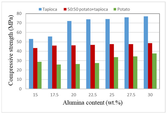 - The highest calculated compressive strength was 76.89 MPa (20 wt.% tapioca starch and 30 wt.% alumina), while the lowest calculated compressive strength was 25.82 MPa (20 wt.% potato starch and 17.5 wt.% alumina).