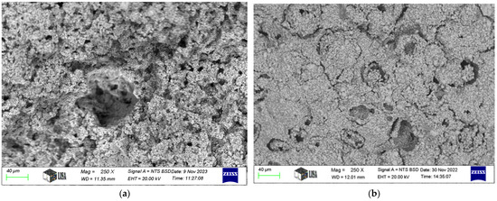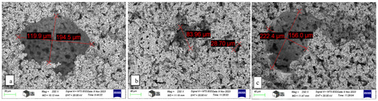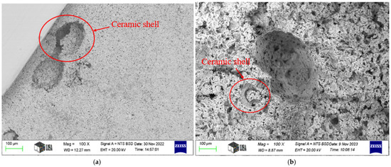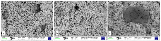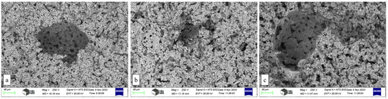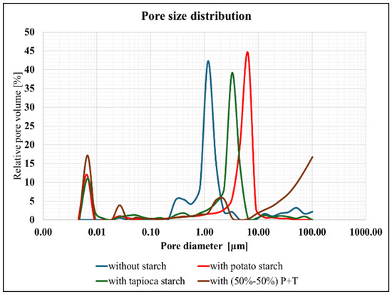 - The presence of ceramic shells inside the pores is diminished when the samples undergo pre-sintering and subsequent gradual sintering. By holding temperatures of 300 °C and 500 °C for an extended duration throughout the progressive pre-sintering and sintering processes, the combustion of starch granules is prolonged. This allows the ceramic shells around the granules to coalesce inside the pores.