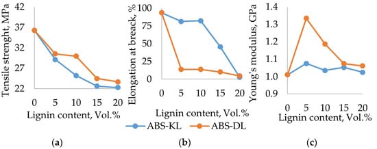| Lignin Fraction, wt. % | Strength, MPa | Elongation, % | Young’s Modulus, GPa |