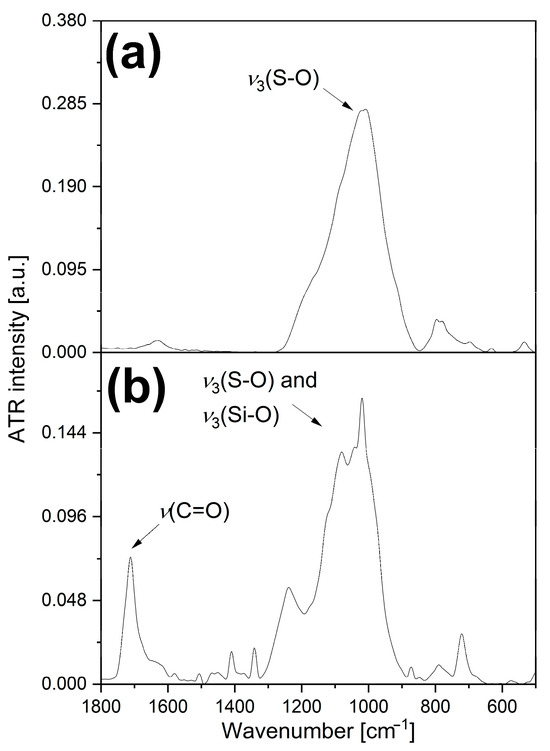 The IR bands of sulfate and silicate species however appear together as a coinciding band system in the region of 1200–800 cm−1 in the spectra of the cricket-free perlite–gypsum sample, whereas further bands of the organic binder (cricket) appeared in addition to the previously reported band system (Figure 2). The most intensive ν3(Si-O) bands (antisymmetric stretching mode) of the tetrahedral SiO4 anions in the silicate components of perlite overlap with the most intensive ν3(S-O) band (antisymmetric stretching mode) of the tetrahedral sulfate ion in calcium sulfate hydrates, resulting in a wide band system. The bands belonging to cricket ν(C=O) appeared only in the IR spectrum of Sample B around 1700 cm−1.