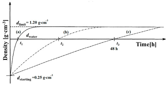 The solid, dashed, and dotted lines belong to three different kinds of granules with different pore sizes and content, resulting in different water-absorbing rates. The density of each dry granule increases with time (t). The penetration of water into all pores results in a density limit, which means the maximum density of the granules when all the pores are filled with water. At the time (t1, t2, or t3) when the density of the granules becomes higher than the density of the water, the granules will sink. To reach this point, a part of the originally open pores in perlite or pumice should be closed by a “cork”. We used moderately water-soluble conditioning agents such as carboxymethylcellulose, which can slowly dissolve in water, opening the route (channels) for the water infiltration into the originally open but temporarily closed pores. This process takes ca. 24–48 h, and the “corks” become permeable by water. When these “corked’” pores (Figure 4) are filled with water, due to the exchange of the air in these inner pores, the granules can sink (the density becomes >1 g/mL).