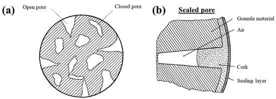 A schematic representation of a perlite granule with open and closed pores (a), and the “cork” and the outer sealing layer of the BTI–CMC–gypsum–cricket and CMC–BTI mixtures (b), respectively.
