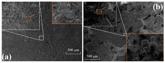 The optimal parameters (density, floating ability, sinking time) were found for the case of the perlite-to-gypsum ratio (by weight) 1:2, namely, the use of the same amount of starch and gypsum and the use of a five times larger amount of hot water than starch to make the cricket solution. The density and BET surface area of the cricket-containing granules were found to be 0.25 g·mL−1 and 27 m2·g−1, respectively, whereas the cricket-free composite had 0.35 g·mL−1 density and 41 m2·g−1 BET surface area. The morphology of the granules’ surfaces is shown in Figure 5.
