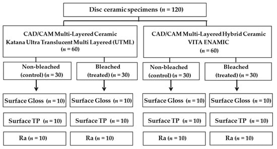 A total of 120 specimens (60 specimens each material) were produced by cutting the blocks of the CAD/CAM multi-layered ceramic material into slices. The specimens were evenly distributed into two groups (bleached and non-bleached) of 30 specimens. These were divided into three subgroups of specimens (n = 10) for the examination of surface gloss, translucency parameter (TP), and surface roughness (Figure 1).