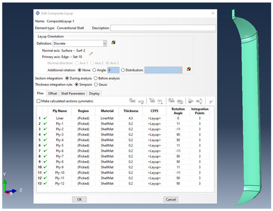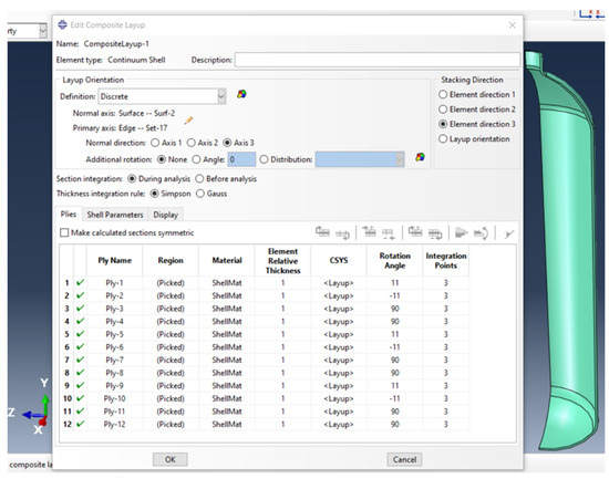 To build a model using continuum shell elements, we divided it into two parts: one for the liner and the other for the composite shell. The first part accurately represents the liner’s geometry, including its varying thickness. The second part represents all the layers combined, accounting for their total thickness. The liner’s properties are introduced as a homogeneous section based on engineering constants and are meshed as a single layer using continuum shell elements. On the other hand, the composite shell properties are introduced using the Abaqus composite layup feature, with each of the twelve plies assigned a relative thickness of 1. The same procedure used in conventional shell elements is followed for the stacking sequence and orientation angles, as shown in Figure 3. The composite shell part is meshed using SC8R elements, which are 8-node quadrilateral in-plane general-purpose continuum shells with reduced integration, hourglass control, and finite membrane strains. This method is not only practical and straightforward to implement but also cost-effective in terms of computational time. We utilized this method to simulate both the bare liner and the full tank. The mesh converged using 18,920 linear hexahedral elements SC8R and 280 linear wedge elements SC6R corresponding to 19,200 nodes.