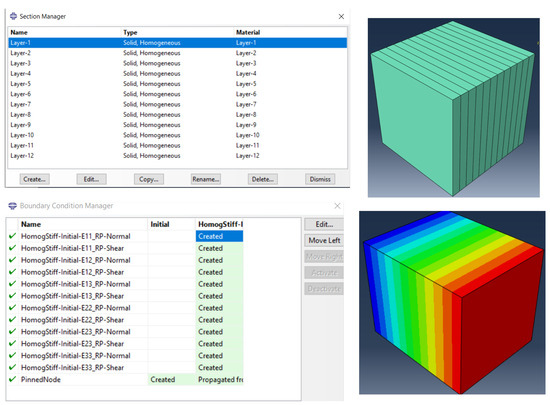 Figure 4 shows the Abaqus-based computational model used to determine the three-dimensional effective properties and the ABD matrix for both the solid-to-solid and solid-to-shell homogenization scenarios. This model represents a composite with a specific stacking sequence of (, )3, as illustrated in Figure 2. Each layer within this sequence has a thickness of 0.2 mm, and the properties associated with these layers are detailed in Table 1. Table 2 reports the three-dimensional effective properties for the solid-to-solid homogenization, while Equation (12) provides the upper triangular part of the symmetric ABD matrix corresponding to the solid-to-shell homogenization.