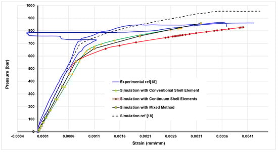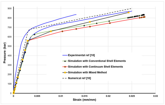 Comparison Between the hoop strain and the applied internal pressure obtained with the conventional shell element, continuum shell element, and mixed method and the experimental and numerical results of the reference.