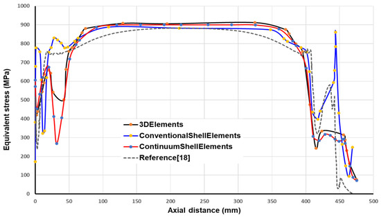 Comparison Equivalent stress vs. axial distance along the inner surface of the bare liner at 700 bar using conventional shell elements, continuum shell elements, and 3D elements.